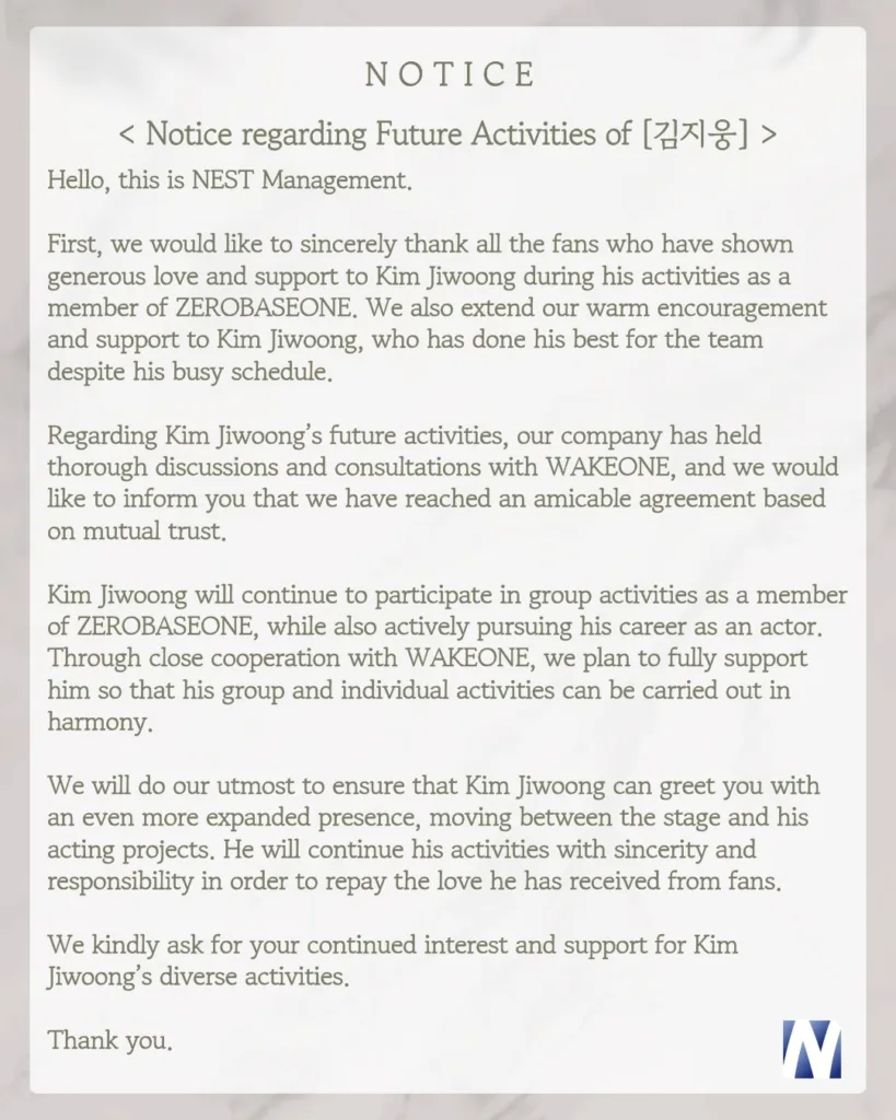 Kim Tae Rae já possui contrato com a WAKEONE, e foi revelado no início desta semana que Seok Matthew e Park Gun Wook também assinaram com a agência recentemente. Sung Han Bin e Kim Ji Woong permanecerão em suas respectivas empresas, THE L1VE e NEST Management, mas seguirão atuando como integrantes do ZEROBASEONE.